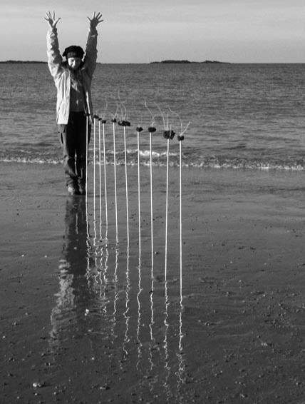 Installation éphémère réalisée sur la plage Duguesclin près de Saint-Malo en Bretagne nord et aligné en direction de l'Islande.